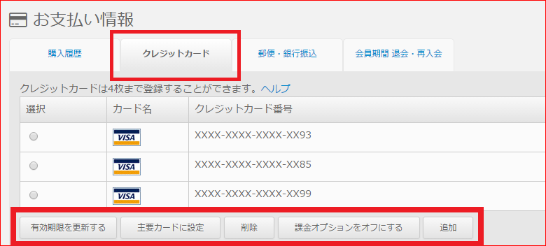 ■ 継続課金をするクレジットカードを変更したい場合は新しいクレジットカード番号を追加後、以前ご利用されていたカードを全て削除して下さい。