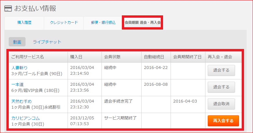 「マイアカウント」→ 動画サイト情報内 「会員期間/退会・再入会」よりご確認いただけます。