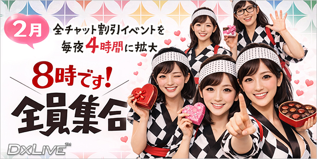 2月も DXLIVE の全チャット割引イベントが、毎晩8時から4時間! 🎉
