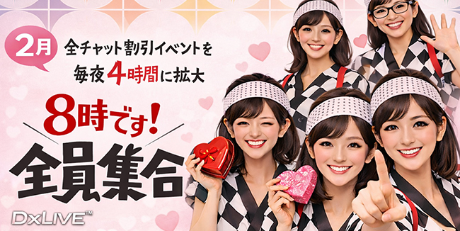 詳細はこちら» 2月も DXLIVE の全チャット割引イベント、毎晩【夜8時から4時間】開催中! 🎉