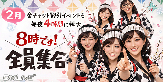 今月も DXLIVE の全チャット割引イベント、毎晩【夜8時から4時間】開催中! 🎉